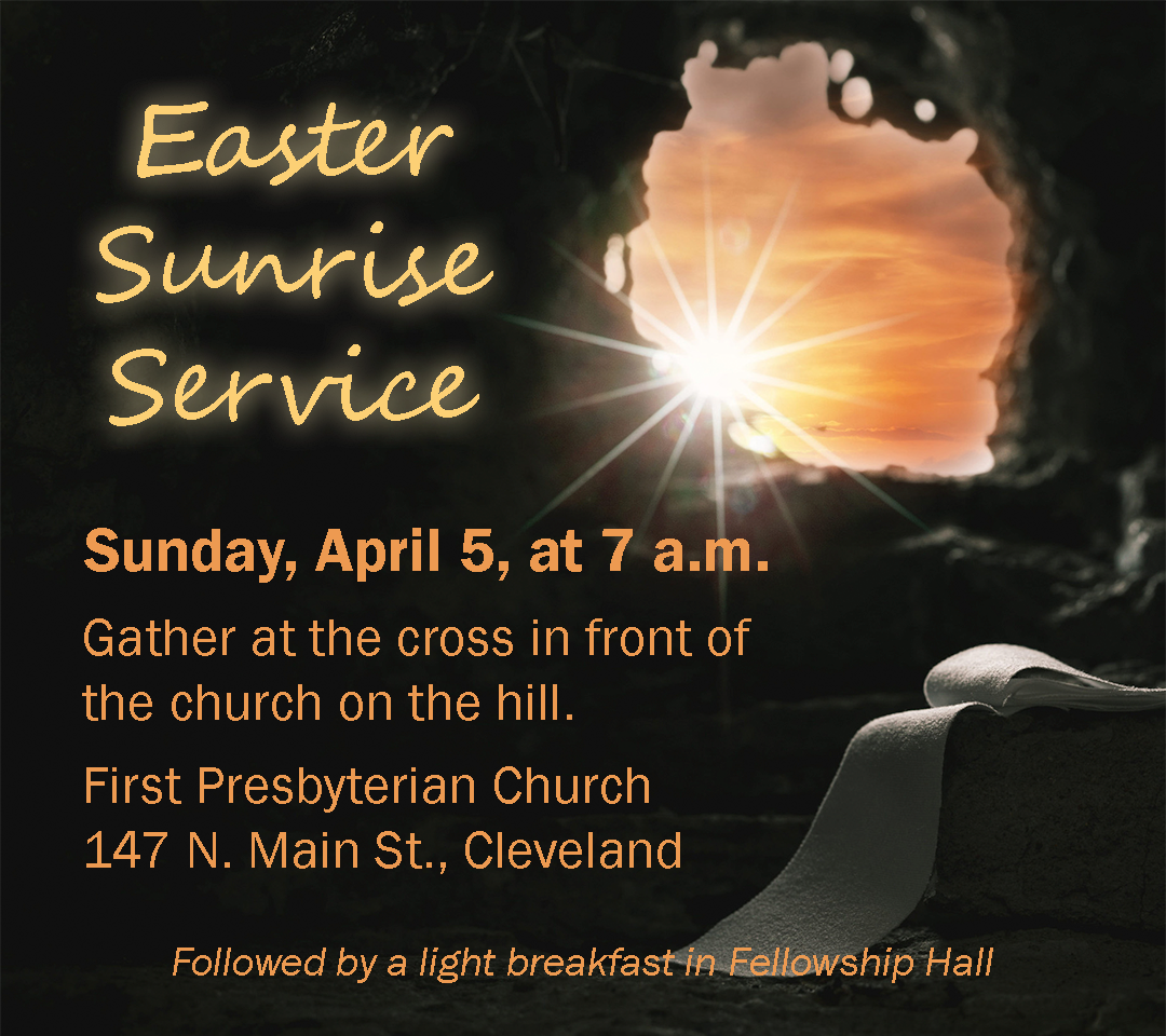 The Sunrise Service will be held in the area in front of the church doors so we will have a good view of the rising sun. Please bring a lawn chair and dress for the outdoors. There will be a brief, informal service with music and the bringing of flowers to the cross. Coffee, juice, and breakfast pastries will be available in Fellowship Hall following the service.