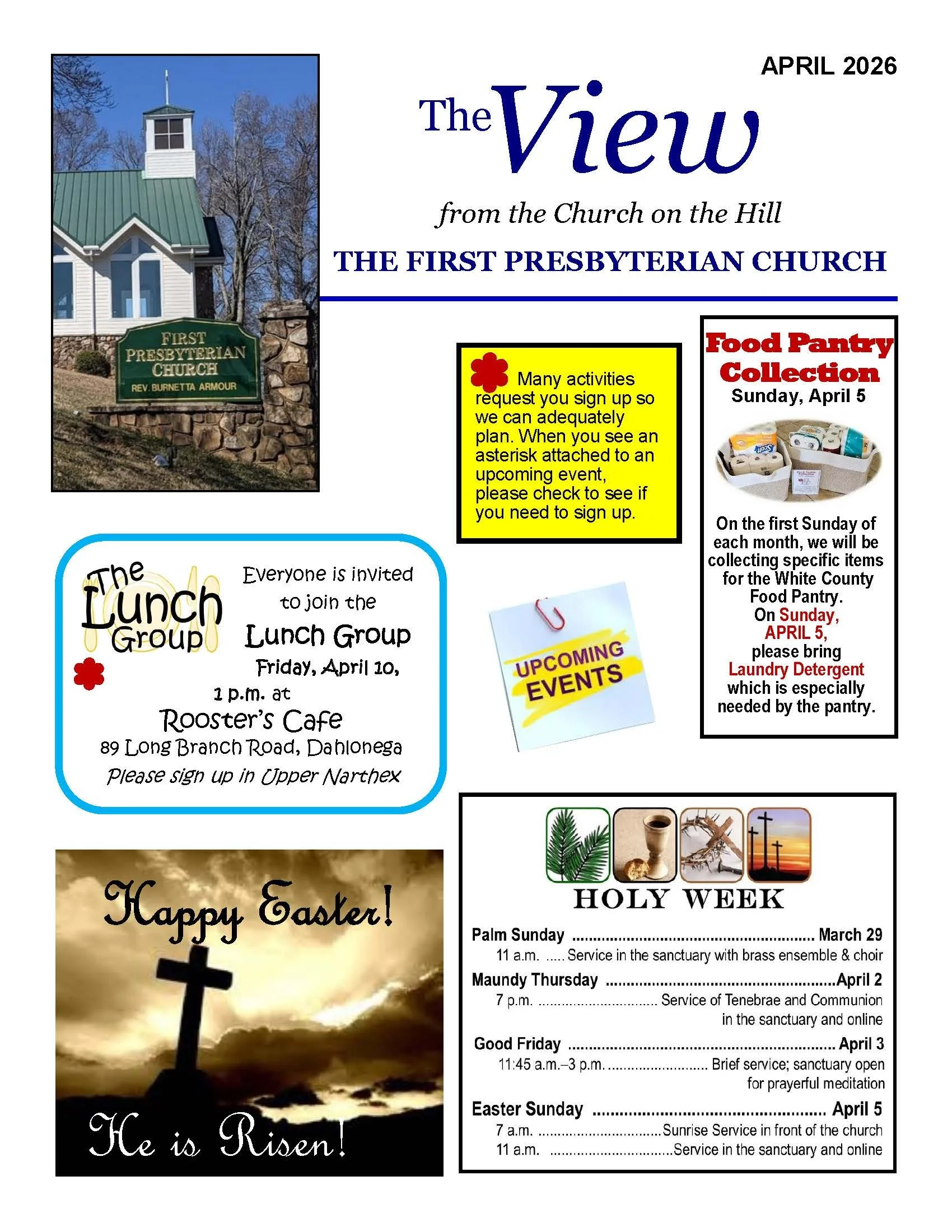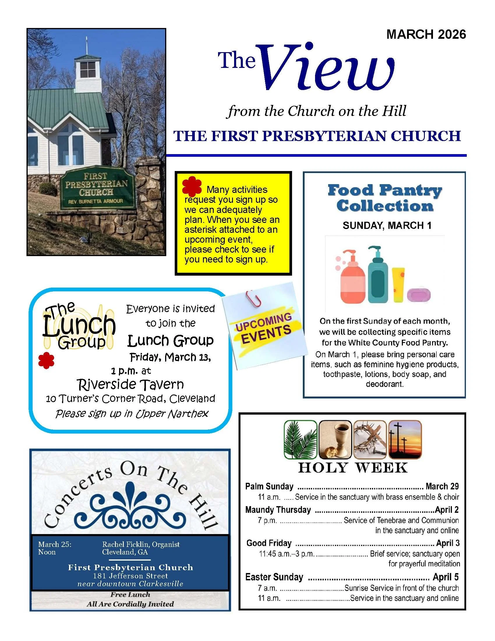 The View is a monthly newsletter published by the First Presbyterian Church. It includes photos and summaries of recent activities and information about what will be happening in the coming weeks.